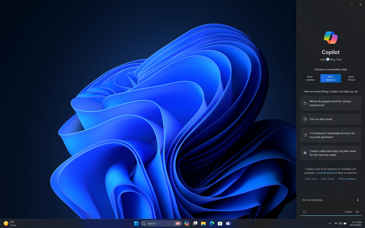 빙챗(Bing Chat)처럼 윈도우 코파일럿에게 간단한 질문부터 복잡한 질문까지 다양한 질문을 할 수 있습니다. 예를 들어, 특정 시간에 사이프러스에 있는 가족에게 전화를 걸고 싶다면 현지 시간을 빠르게 확인할 수 있습니다. 사이프러스를 방문할 여행을 계획하고 싶다면 'Copilot in Windows'에게 중겨울 휴가를 위한 항공편과 숙소를 찾아달라고 할 수 있습니다. 새로운 대화 스레드를 시작하려면 이전 채팅 대화를 지우는 "새로운 주제" 버튼을 사용하세요.