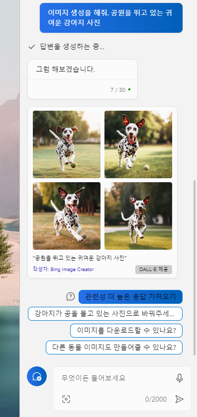 윈도우 코파일럿을 사용하면, 달리(DALLE) 인공지능을 사용하여 그림을 쉽게 그릴 수 있습니다.
