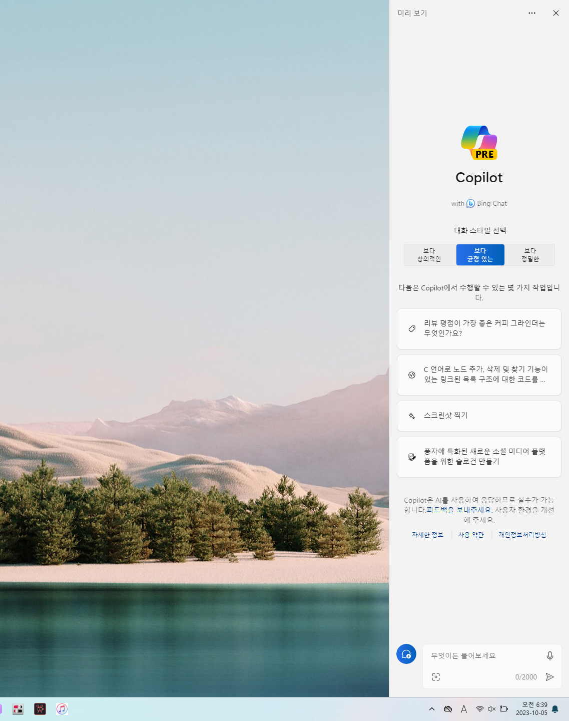 필자가 사용한 윈도우 코파일럿 (Copilot in Windows)는 현재 프리뷰(미리보기) 버전으로 제공됩니다.
