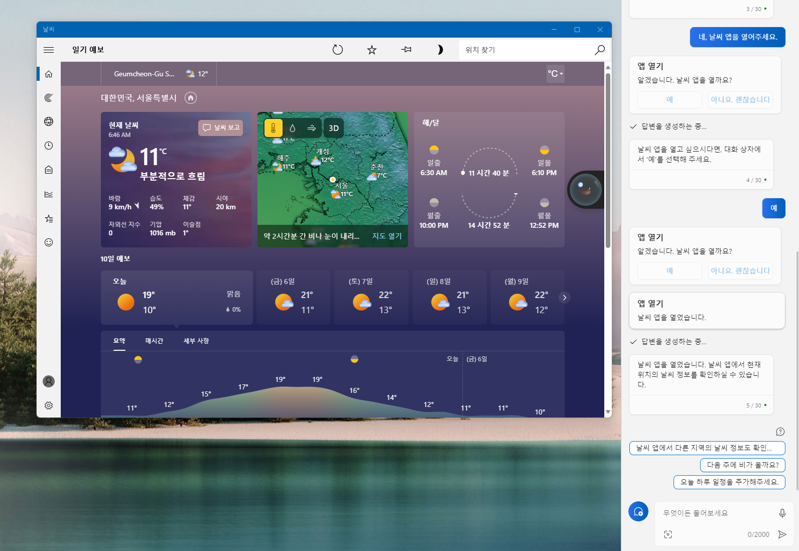 채팅을 하듯 궁금한 날씨 정보 등도 물어보면, 빙챗을 이용하여 검색하여 실시간 정보를 제공합니다.