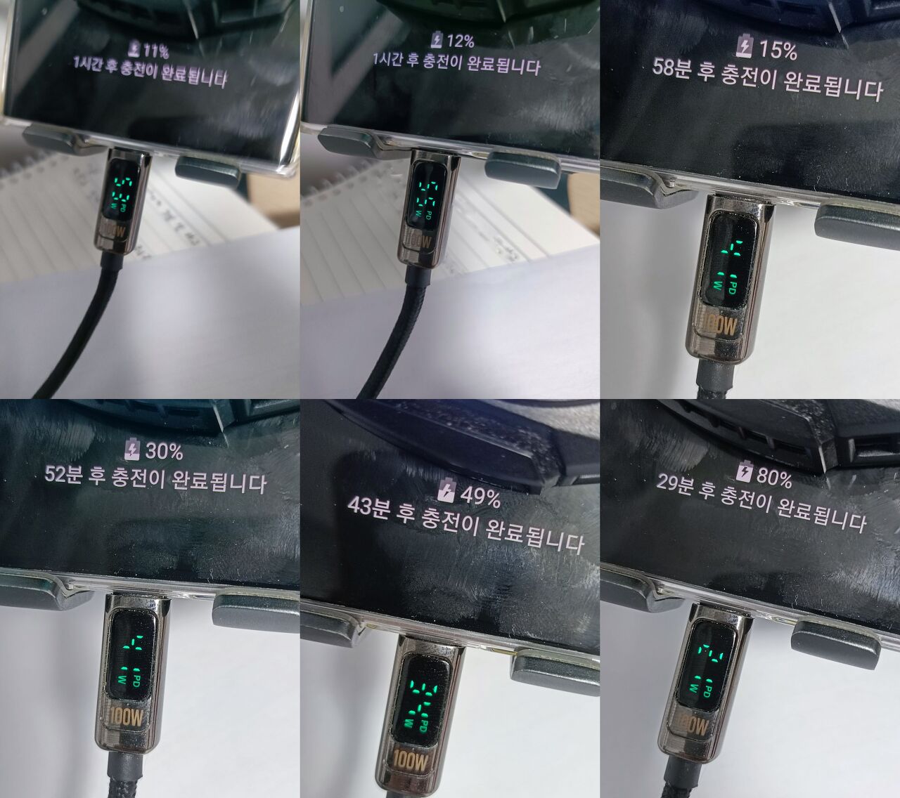 0%에서 50%까지 약 30분이고, 완전히 충전하는 데 약 90분에서 2시간이 걸립니다.