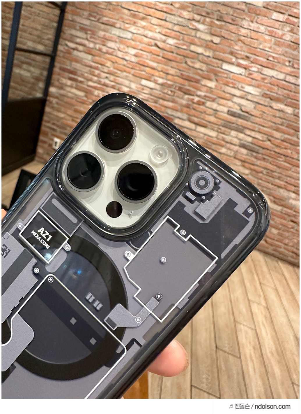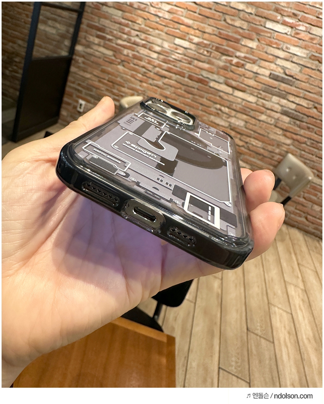 아이폰 15의 내부가 보이는 회로도 재미도 주는 케이스입니다. 슈피겐의 아이폰 15 맥세이프 케이스로 울트라하이브리드 맥핏 제로원이라는 케이스입니다.