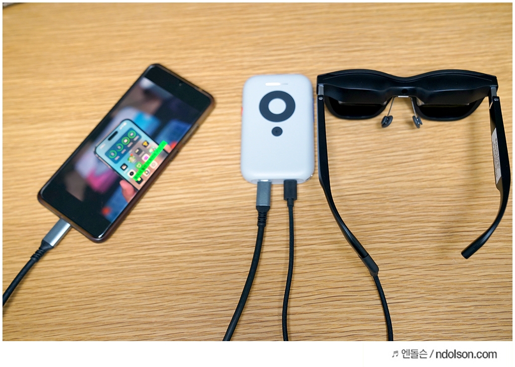 '엑스리얼 에어(XREAL Air)'와 '엑스리얼 빔(XREAL Beam)'는 한 세트로 구성되어 있습니다. '엑스리얼 에어'는 안드로이드 스마트폰과 직접 연결이 가능하지만, 아이폰 사용자는 별도의 컨버터가 필요하게 됩니다.