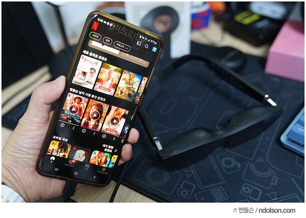 집에서 누워서 또는 지하철, 버스, 카페 다양한 장소에서 엑스리얼 에어(XREAL Air)로 동영상 시청과 게임을 즐겨보았습니다. 넷플릭스의 영상을 스마트폰의 6.7인치보다는 최대 320인치의 대화면으로 즐기는 게 가능하니, 개인 영화관 느낌이 납니다.