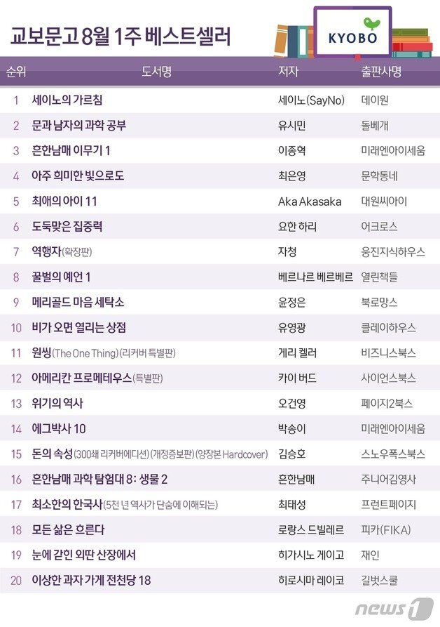 교보문고 8월 베스트셀러 순위, ‘세이노의 가르침’ 21주째 1위로 독보적!
