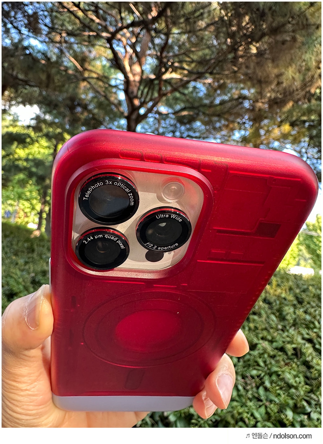 여기에 색깔이 빨강 링을 아이폰 15 카메라 렌즈 강화유리로 끼우니 색깔이 더 이쁘죠?