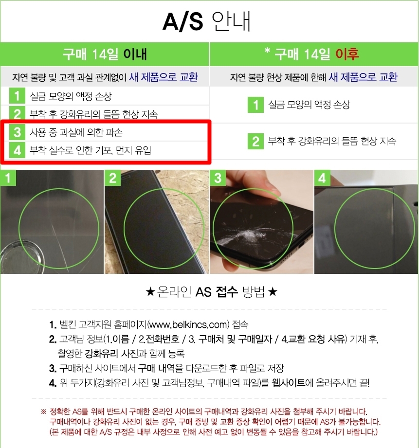 - 들뜸 및 그 외 찍힘, 낙하 등 소비자 과실로 인해 발생한 강화유리 파손 등에 대해서는 교환 불가