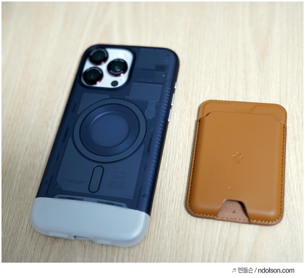 맥세이프 케이스는 대부분 슈피겐 케이스인데, 클래식 C1 맥핏, 그리고 투명 맥세이프 케이스, 거치대가 포함된 슈피겐 아이폰15 투명 맥세이프 스탠드 울트라하이브리드S 맥핏 케이스를 사용합니다. 디자인이 고급스럽게 마감되어 있어 좋습니다.