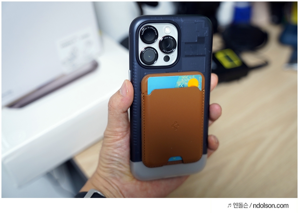 필자는 애플페이도 있지만, 신용카드는 따로 들고 다닙니다. 그래서 아이폰 15 슈피겐 맥세이프 나노팝 맥세이프 월렛 카드지갑과 아이폰 15 맥세이프 가죽 카드 3장 수납 지갑 발렌티누스 카드케이스를 사용하고 있습니다.