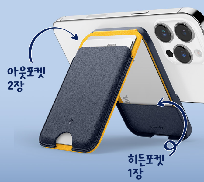 무려 카드 3장을 넣을 수 있고, 스탠드 기능도 있어 가로/세로로 동영상 시청할 때, 맥세이프 케이스에 붙여 사용할 수 있습니다.
