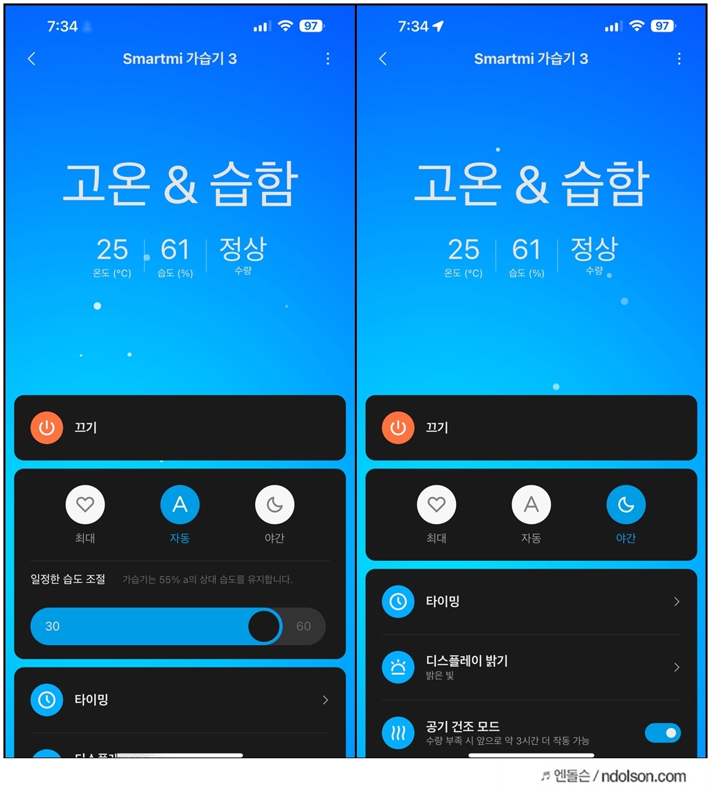 앱에서 자동으로 하면 설정된 습도까지 알아서 조정합니다.