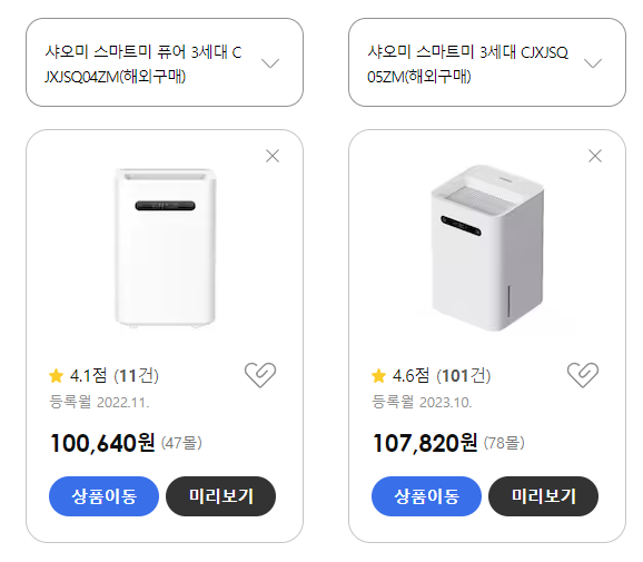 샤오미 스마트미 퓨어 3세대(CJXJSQ04ZM), 샤오미 스마트미 3세대(CJXJSQ05ZM) 두 모델은 다른 모델이며, 스펙을 비교하였습니다. "퓨어" 차이가 납니다.