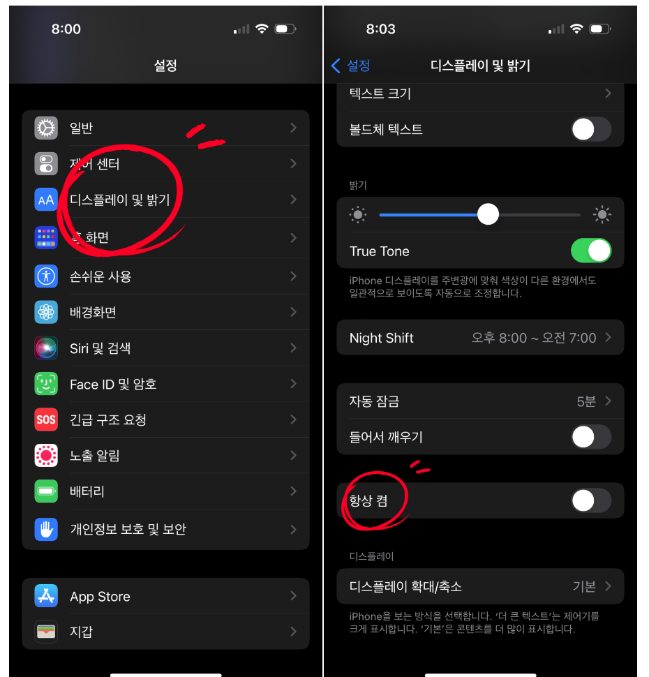 설정 > 디스플레이 및 밝기 > 화면 상시표시 > 끔