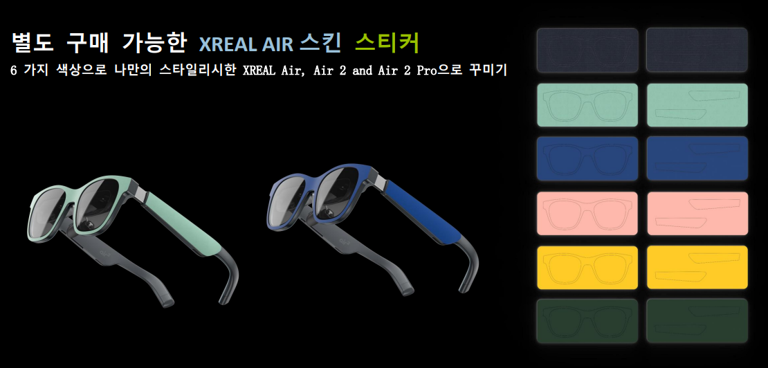 또 더 엑스리얼 에어 스킨으로 꾸며볼 수 있습니다. 사용자의 스타일을 반영할 수 있는 액세서리로 "엑스리얼 에어 스킨 스티커"도 있습니다. 원하는 색상과 스타일로 꾸며볼 수 있겠네요!