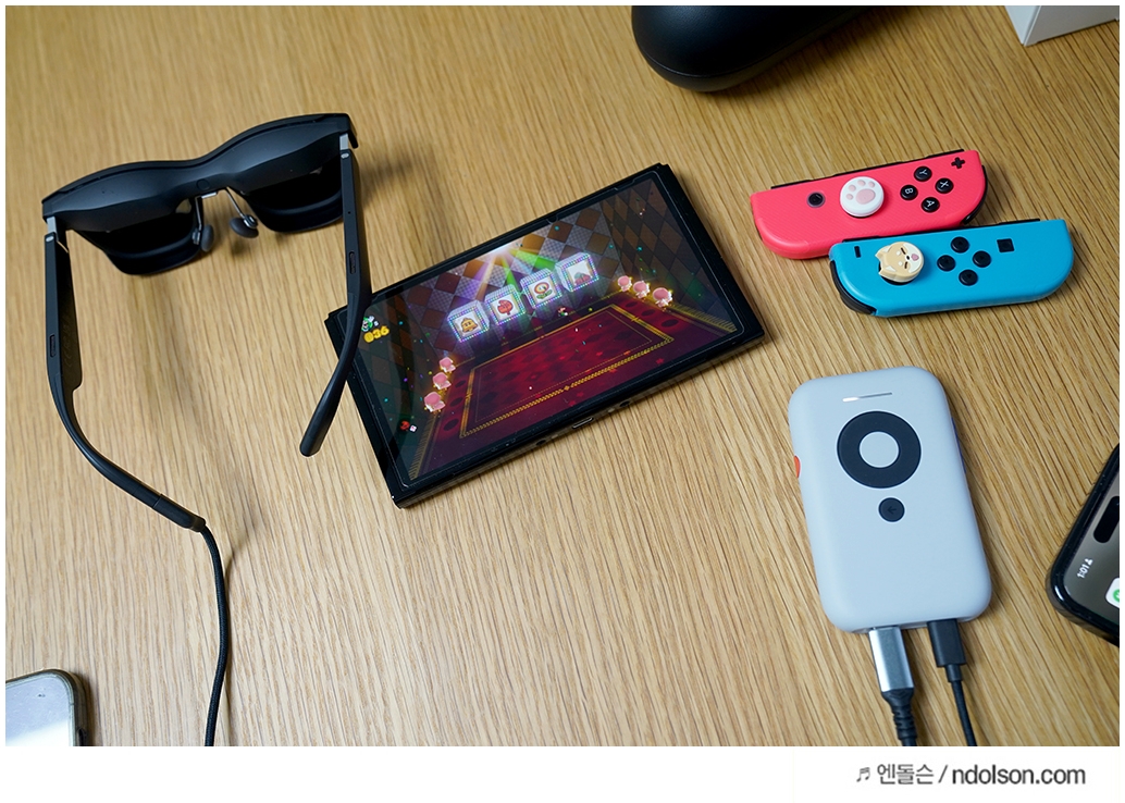 엑스리얼빔이 있어 닌텐도스위치나 다른 게임기기들과의 연결 허브로의 역할을 해줍니다. 특히 아이폰 14 이하로는 라이트닝 케이블을 사용하는 데, 아이폰의 무선 연결도 엑스리얼빔이 있어 지원이 가능합니다.