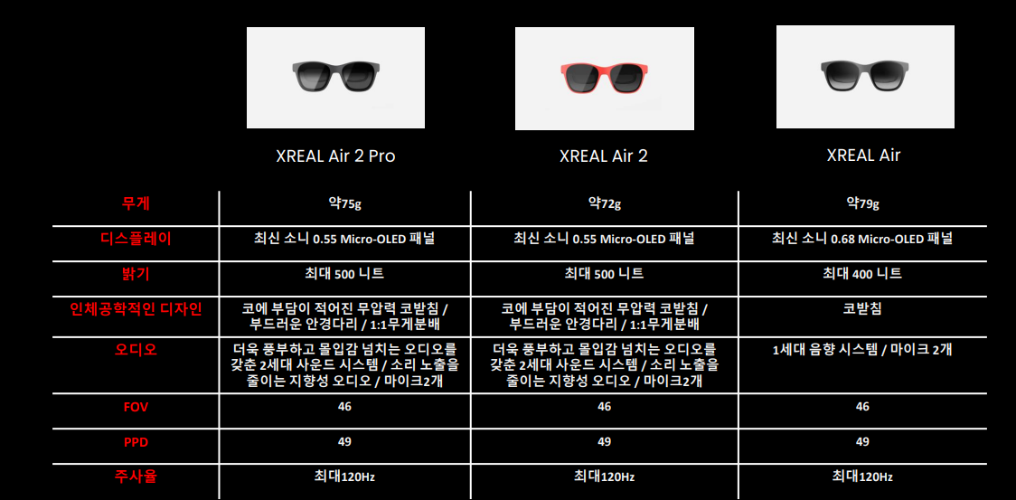 엑스리얼 AR 글래스 제품별의 스펙을 보면, 조금씩 차이가 나는 것을 알 수 있습니다. 신제품으로 갈수록 무게도 더욱 가벼워졌고, 스마트 글래스의 디스플레이 밝기가 최대 500니트로 밝아져 야외 시안성이 더욱 개선된 것을 알 수 있습니다. 또 디자인도 조금 더 세련되게 변화되었습니다.