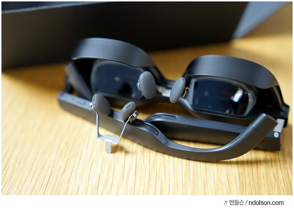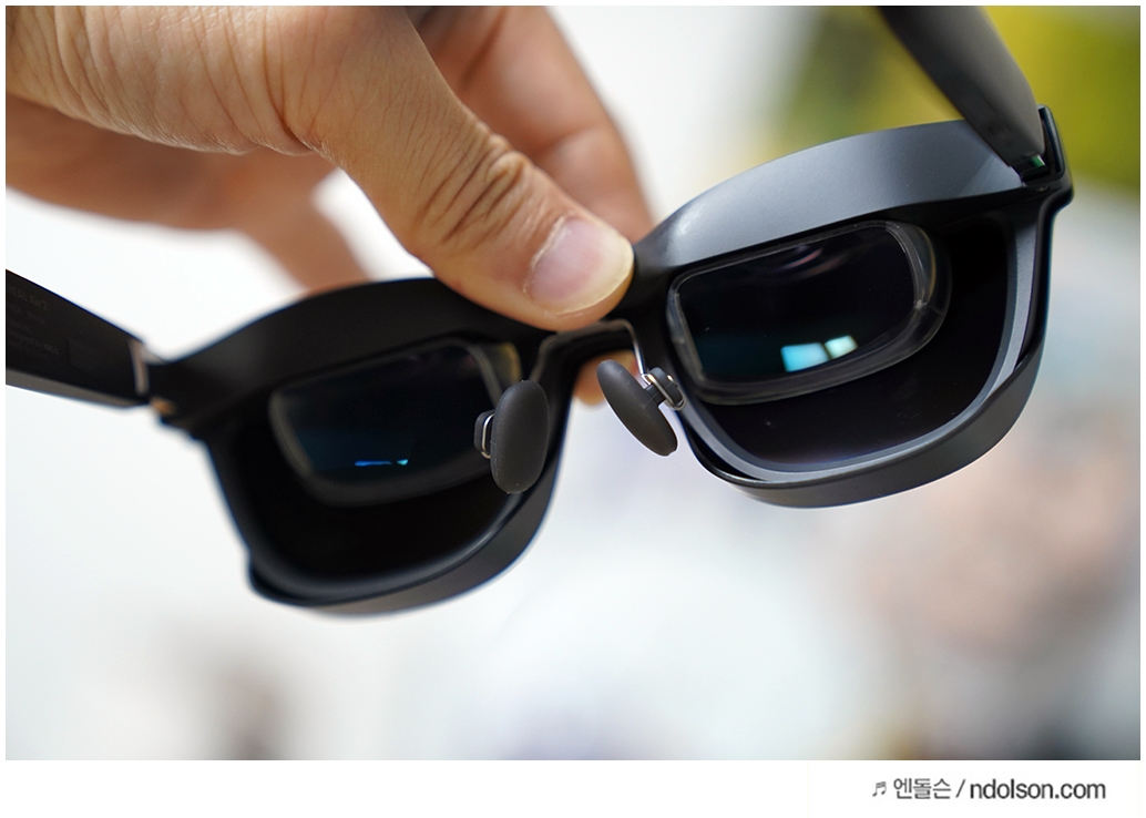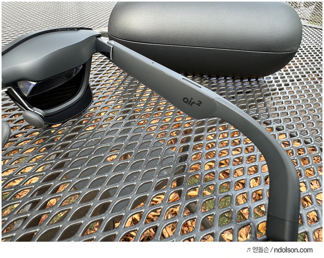 엑스리얼의 AR글래스는 XREAL Air 2 Pro 프로까지 다양한 제품군이 존재합니다. 필자가 체험한 XREAL Air 2는 소니의 최신 Mirco-OLED 패널과 최대 120Hz 주사율을 지원하는 제품입니다. 테두리 옆면에 XREAL Air 2가 각인되어 있습니다.