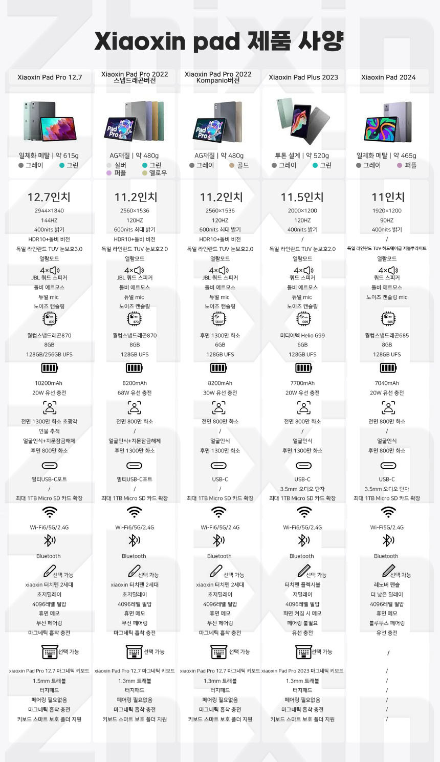 현재까지의 샤오신패드의 라인업별 스펙정보입니다.