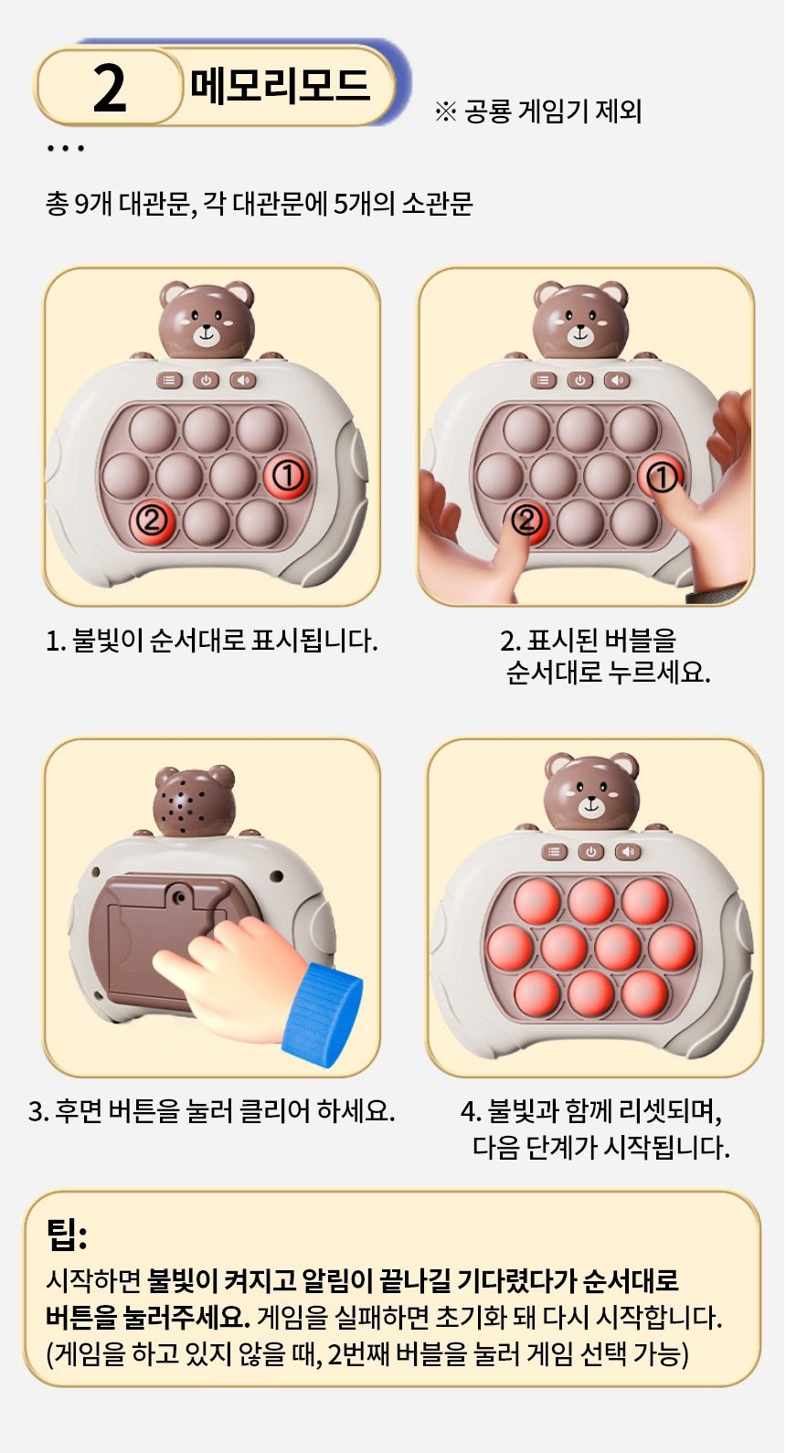 메모리모드는 순서대로 버블을 누르며 기억력을 향상할 수 있는 좋은 방법입니다.