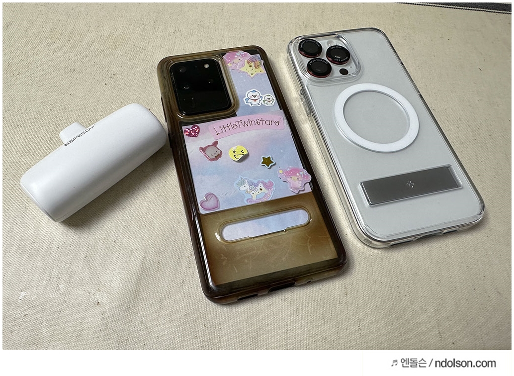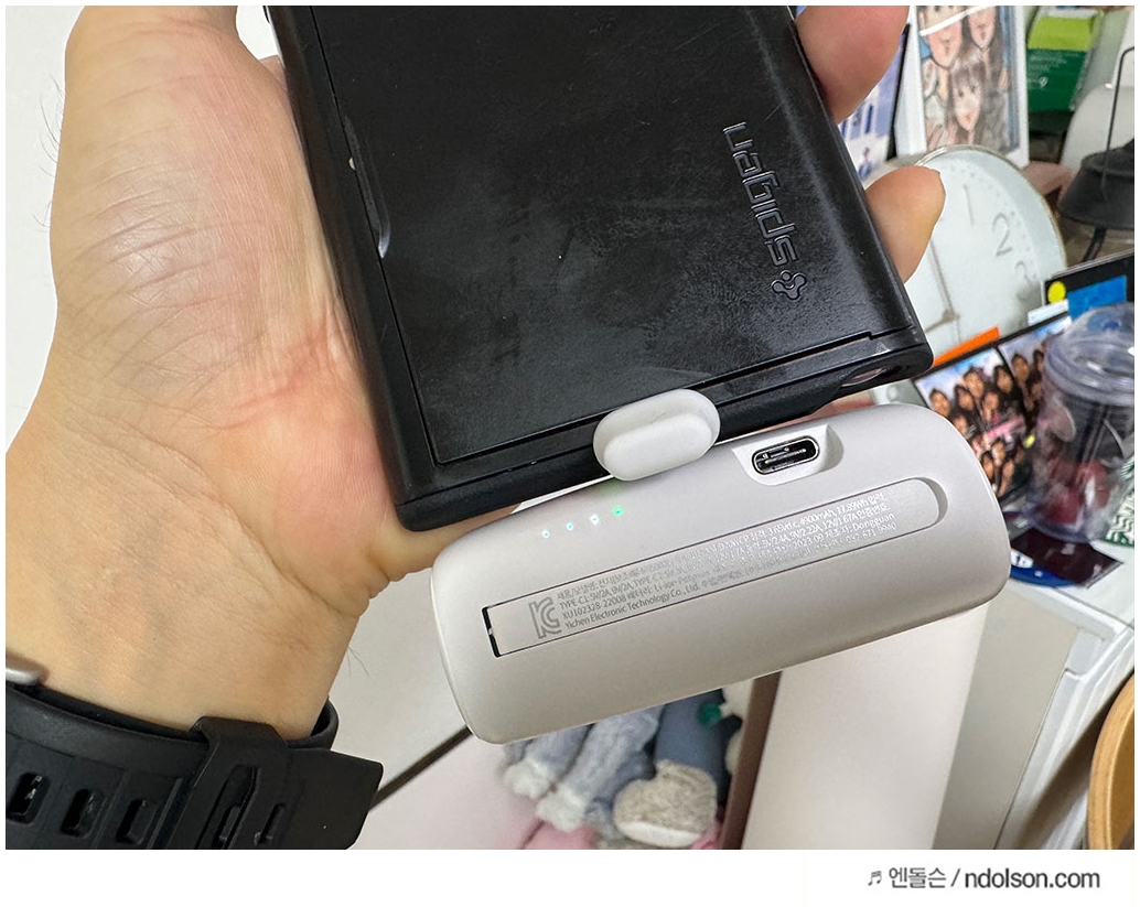 사이즈도 최소형 사이즈에 그립감도 좋은데, 5000mAh 용량을 자랑합니다. 충전단자 보호캡과 함께 USB-C 타입 포트 2개가 있어 아이폰 15 사용자도 이번에 USB-C 타입으로 바뀌여서 완벽하게 호환됩니다. 갤럭시 S23 울트라와 아이폰 15, 갤럭시 S20 울트라를 사용하는데, 초고속충전이 돼서 역시 무선 보조배터리보다는 20W PD 충전으로 빠르구나를 느꼈습니다.