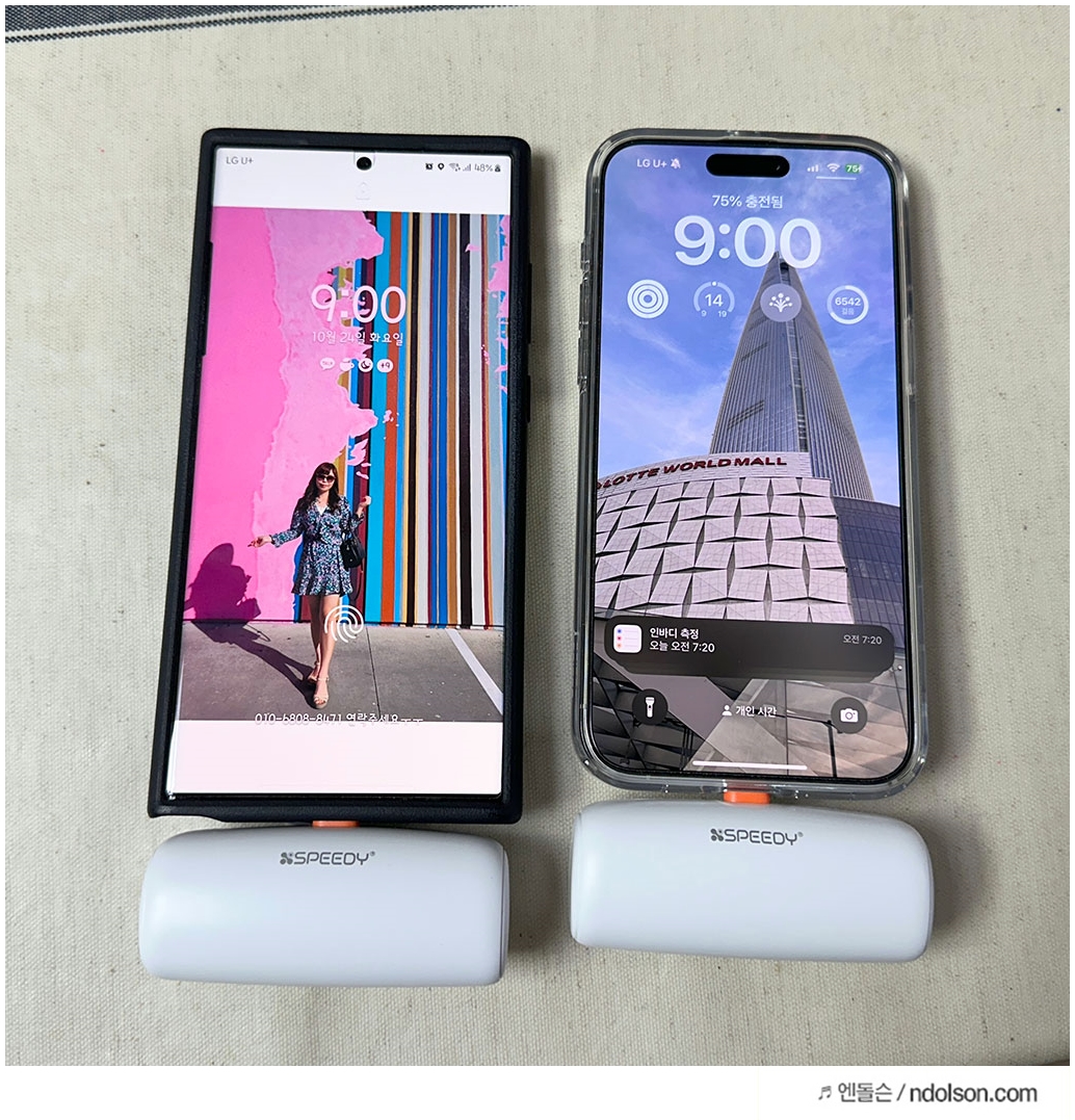 여행을 앞두고 계신 분들에게 특히 추천드리고 싶어요. 1+1으로 구매해서 1개씩 번갈아 쓰기 좋은 사이즈입니다. 하루 종일 야외 활동으로 카메라, 동영상 촬영을 많이 하면 배터리가 빨리 닿잖아요. 그런데, 스피디 PD 20W 미니보조배터리 를 연결해 두면, 스마트폰 도킹형이라 유선충전 20W 고속충전이 가능해서 배터리 방어가 됩니다. 별도의 USB-C 타입 포트가 있어 추가로 다른 제품도 유선 충전이 가능합니다.