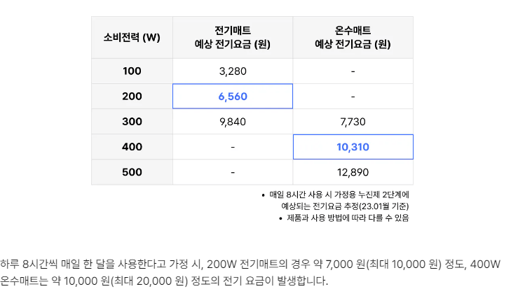 반면에 온수매트는 전기료가 상대적으로 조금 더 나옵니다.