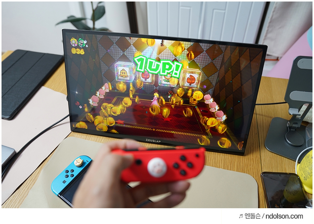 닌텐도 스위치의 젤다, 동물의 숲, 마리오를 주로 즐기는 데, 모니터로 즐길 때 PC데스크톱의 모니터는 들고 다닐 수 없지만, 제우스랩 포터블 모니터는 어디든 들고 다닐 수 있어 좋습니다.
