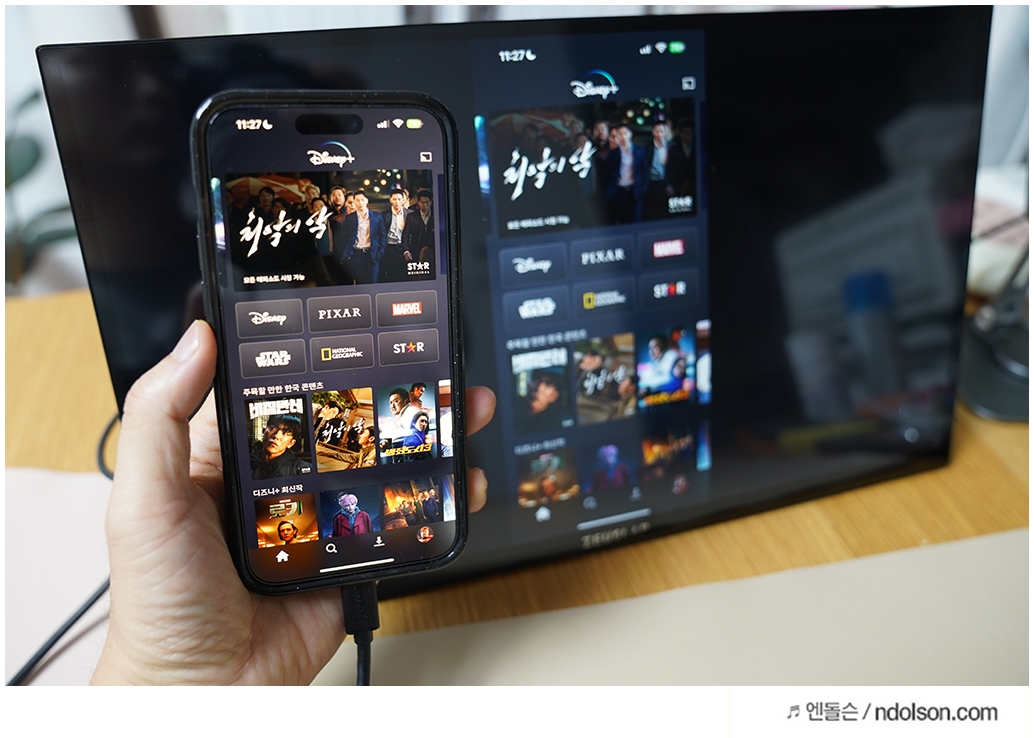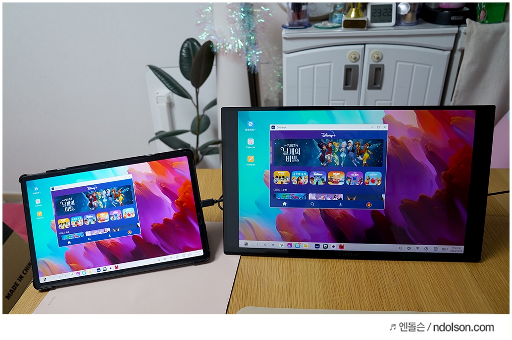 이처럼 활용성이 좋은 게 바로 포터블 모니터입니다. 보통은 스마트폰 연결해서 디즈니플러스, 넷플릭스 등의 동영상 머신으로 삼성덱스 연결해서 쓰거나 USB-C단자로 연결해서 쓰실 겁니다.