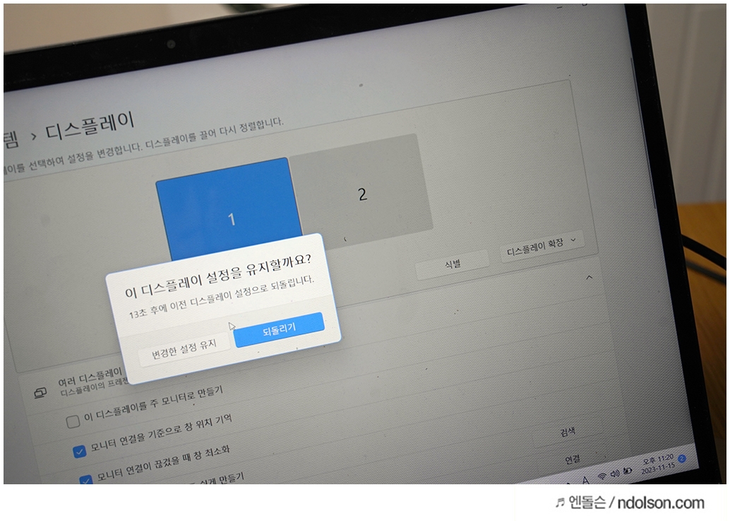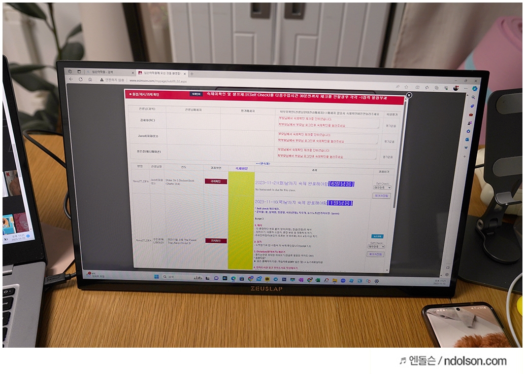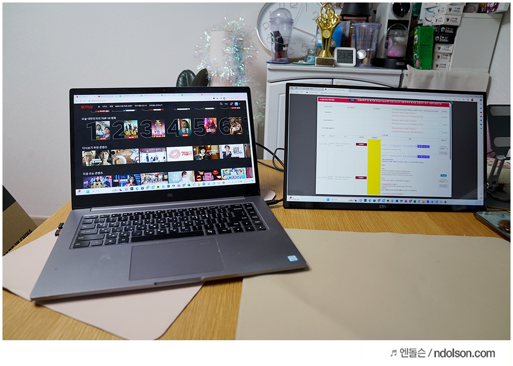 영어 학원 수업 관련해서 노트북으로 피드백을 달고 있는 데, 노트북 한쪽은 영화 보고 한쪽은 일하고 이렇게 듀얼모니터 활용이 가능합니다.