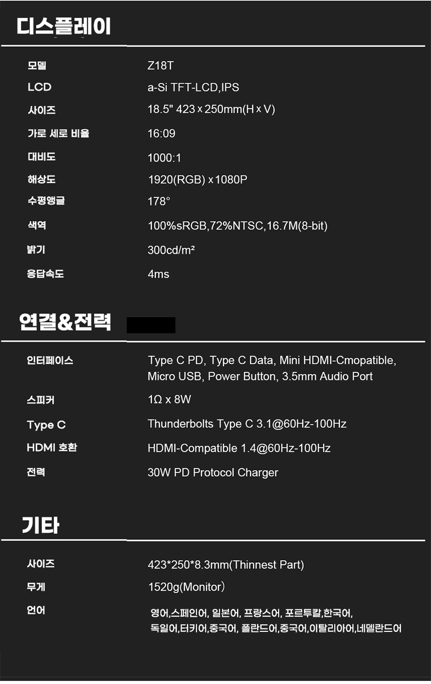 제우스 포터블모니터 Z18T 제품 스펙 정보