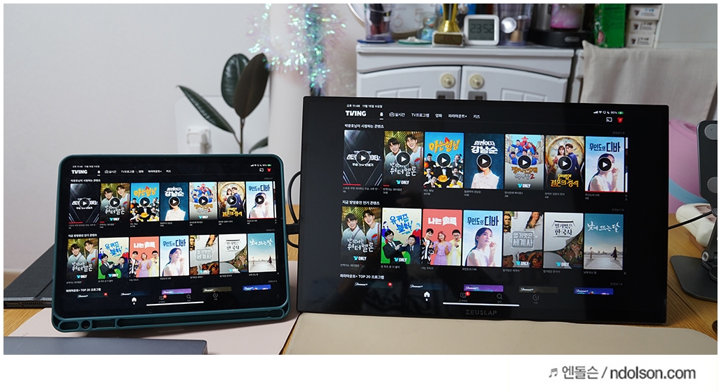 스마트폰을 그대로 미러링 하거나 삼성 DEX, PC모드로 사용할 수 있어 스마트폰에서 구동되는 모든 앱이 보입니다. 화질도 좋습니다. 쿠팡플레이어스, 티빙, 넷플릭스, 디즈니플러스+ 이렇게 보는데, 보는 OTT도 꽤 많아졌네요.