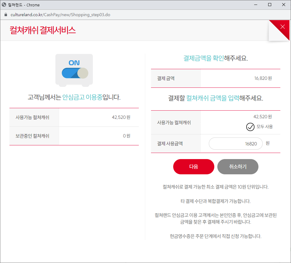 그럼 결재할 때, 처음과 다르게 문화상품권 사용하기를 눌러서 컬쳐랜드 상품권을 사용할 수 있습니다.