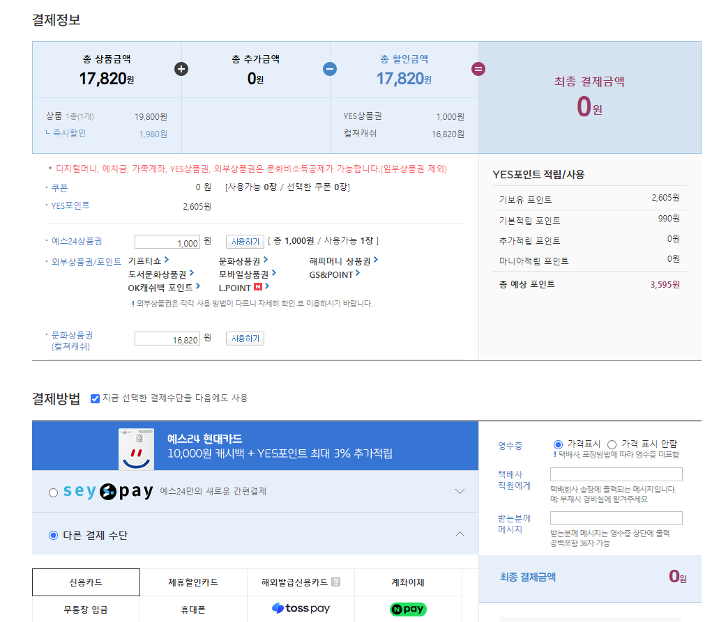 필자는 컬쳐랜드 상품권을 저렴하게(?) 구매해서 컬쳐랜드 캐쉬충전하기를 통해서 충전해 두었습니다. 그래서 예스24 사이트에서 도서를 구매할 때, 사용하고 있습니다. 또 편의점에서도 애용하고 있습니다.