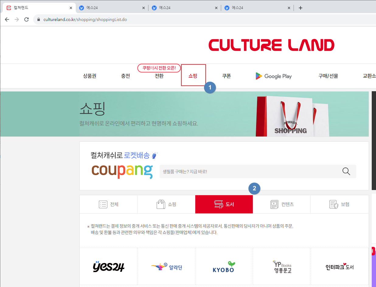 1. 예스24 도서를 쓰기 위해서는 컬쳐랜드 사이트로 이동합니다.