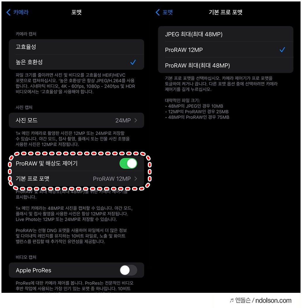1. 카메라 설정 변경: 설정 앱에서 카메라 설정으로 들어가 형식을 선택한 후, ProRAW 및 해상도 제어 옵션을 활성화합니다.