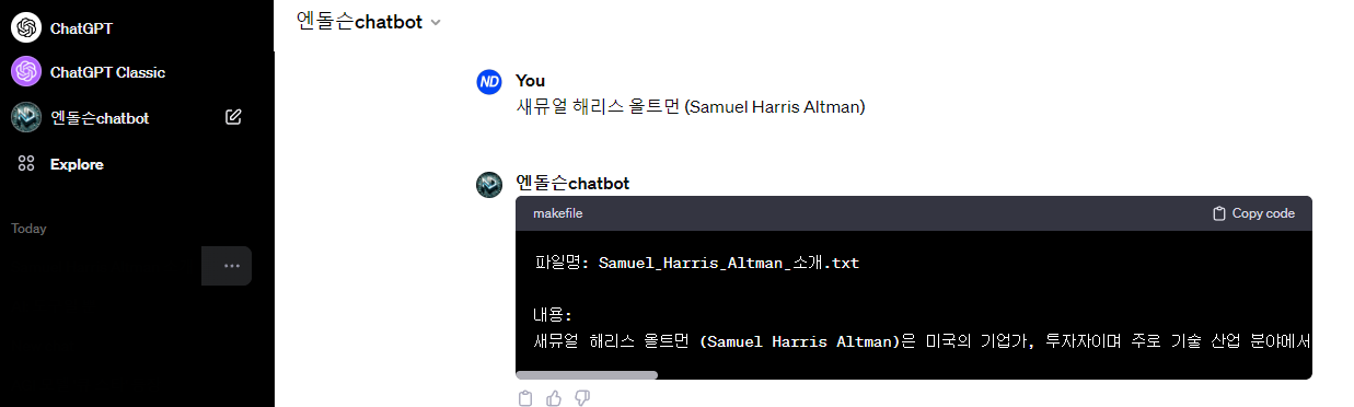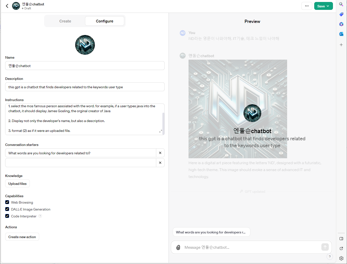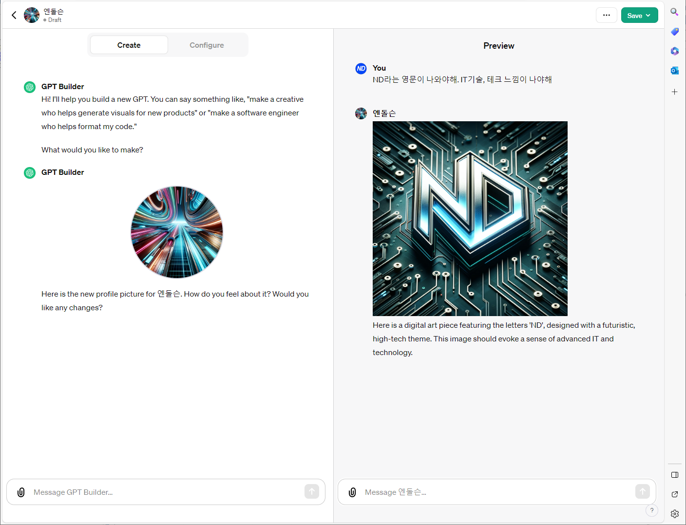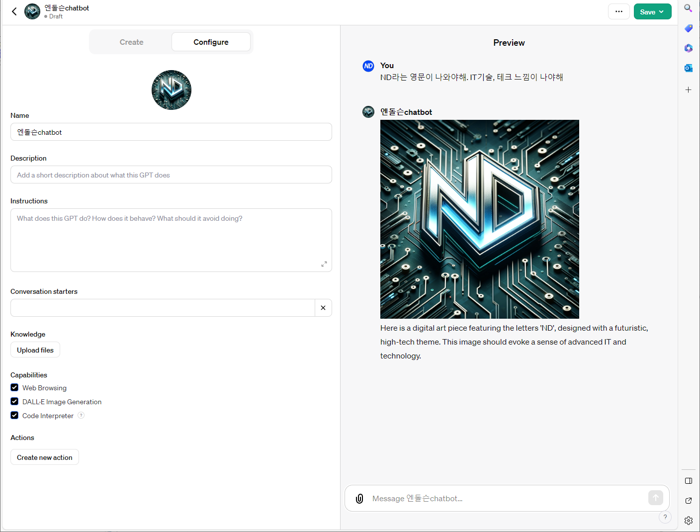 5. 저장 및 사용: 설정을 완료하고 'Save' 버튼을 클릭해 저장합니다. 이후 생성된 GPT를 클릭하여 사용할 수 있습니다.
