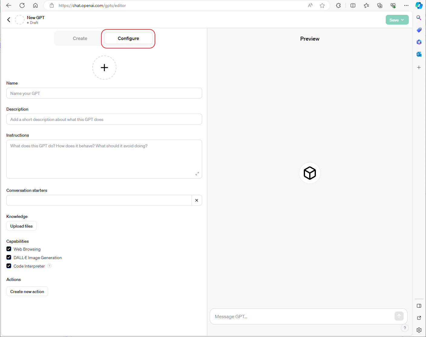 2. GPT 빌더 설정: 'Configure'를 클릭하고, GPT의 세부사항을 설정합니다. 아직 'Create' 기능은 다소 미숙하지만, 향후 개선될 것으로 기대됩니다.