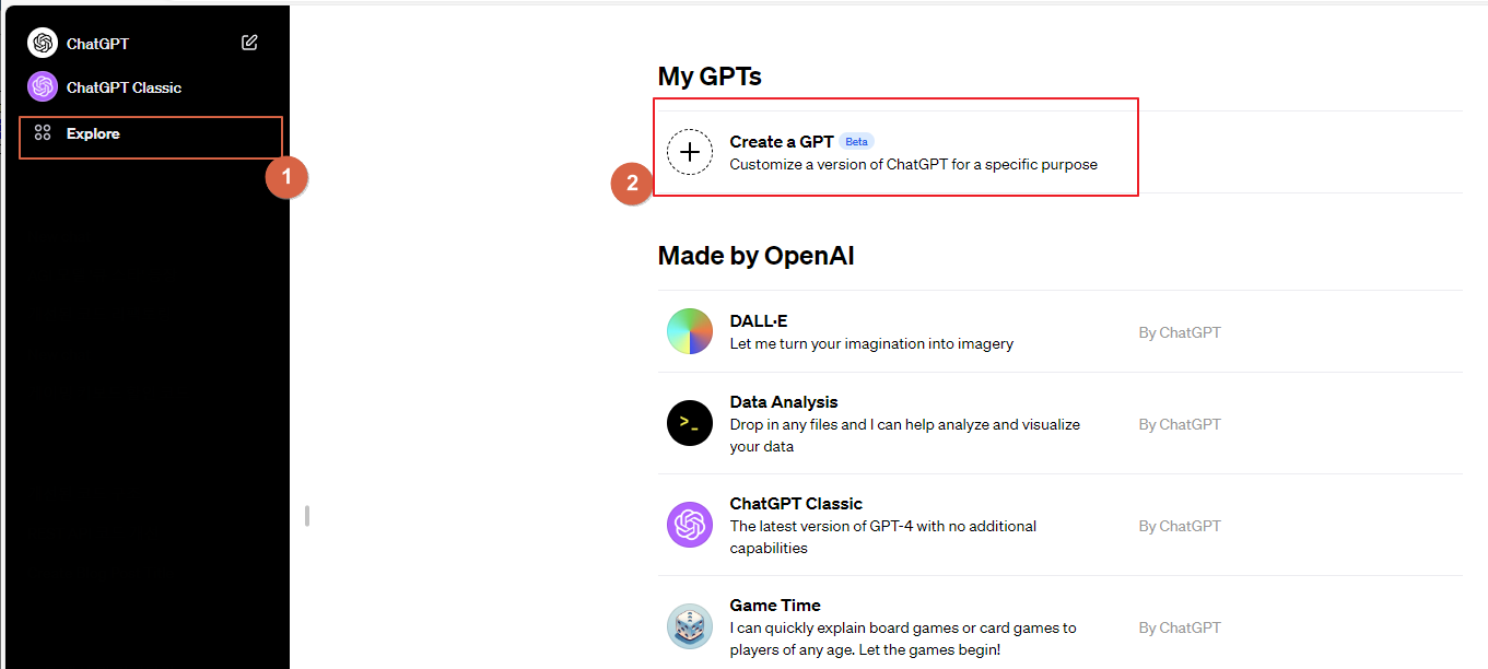 1. 로그인 및 GPT 생성: ChatGPT에 로그인 후, 'Explore' 메뉴에서 'Create a GPT'를 선택해 GPT 빌더를 활성화합니다.