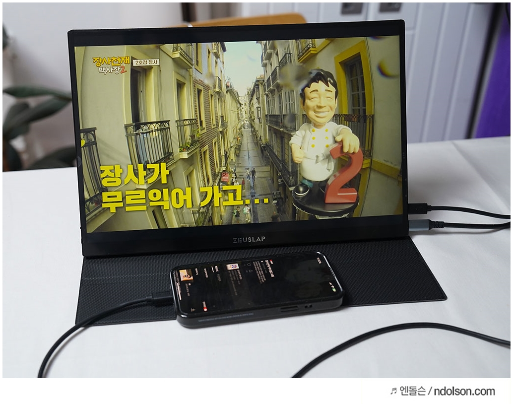 하지만, 아이폰 15 프로맥스와 연결하여 넷플릭스 시청은 인상적이었습니다. '장사천재 백사장 2'를 보는 데, 너무 재미있습니다. 요리하는 장면들이 모니터를 통해 더욱 생생하게 다가왔습니다.