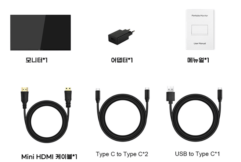 제우스랩 Z16 Max PRO 포터블 모니터의 구성품은 모니터 본체, 어댑터, 사용자 매뉴얼이 있습니다. 또 Mini HDMI 케이블, Type C to Type C 케이블이 있으며, USB to Type C 케이블도 포함되어 있습니다. 모니터를 연결할 수 있는 기기의 다양한 케이블을 제공해 주고 지원해 줍니다.