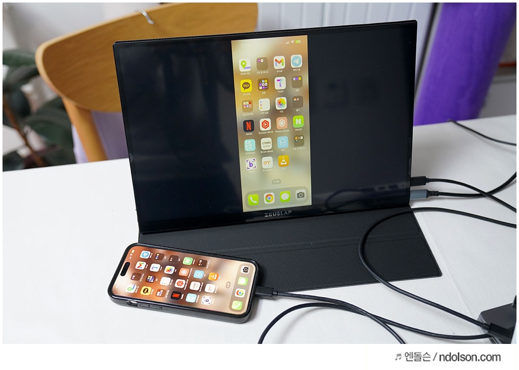 아이폰 15 프로맥스와 갤럭시 스마트폰을 연결하여 넷플릭스, 디즈니플러스 등의 OTT 서비스를 즐기기 좋습니다. USB-C 포트와 mini HDMI 단자 등의 다양한 디바이스 포트를 지원합니다. 그래서 아이폰 15 USBC단자와 연결하니 바로 포터블 모니터로 재생이 됩니다.