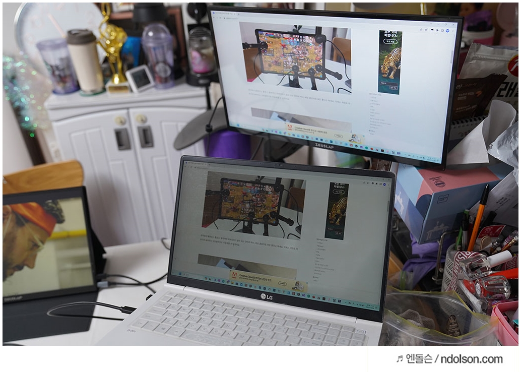 그리고 자주 여행을 다니거나 이동 중에도 작업이 필요한 프리랜서라면 포터블 모니터는 더 좋을 것 같습니다. 제우스랩 Z16 MAX Pro는 16인치의 넓은 화면에 WQXGA(2560 x 1600) 해상도와 놀라운 144Hz의 주사율을 자랑하기에 게임과 사무용 모두 사용이 가능합니다. 터치되는 포터블 모니터로 터치감이 좋고 화질도 선명하고 가격도 저렴한 편이라 만족스러웠습니다.