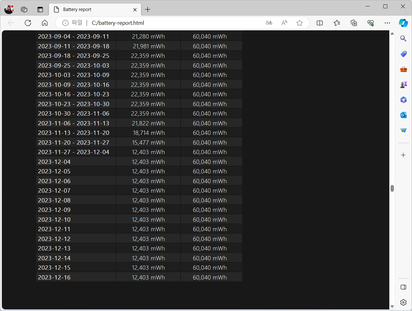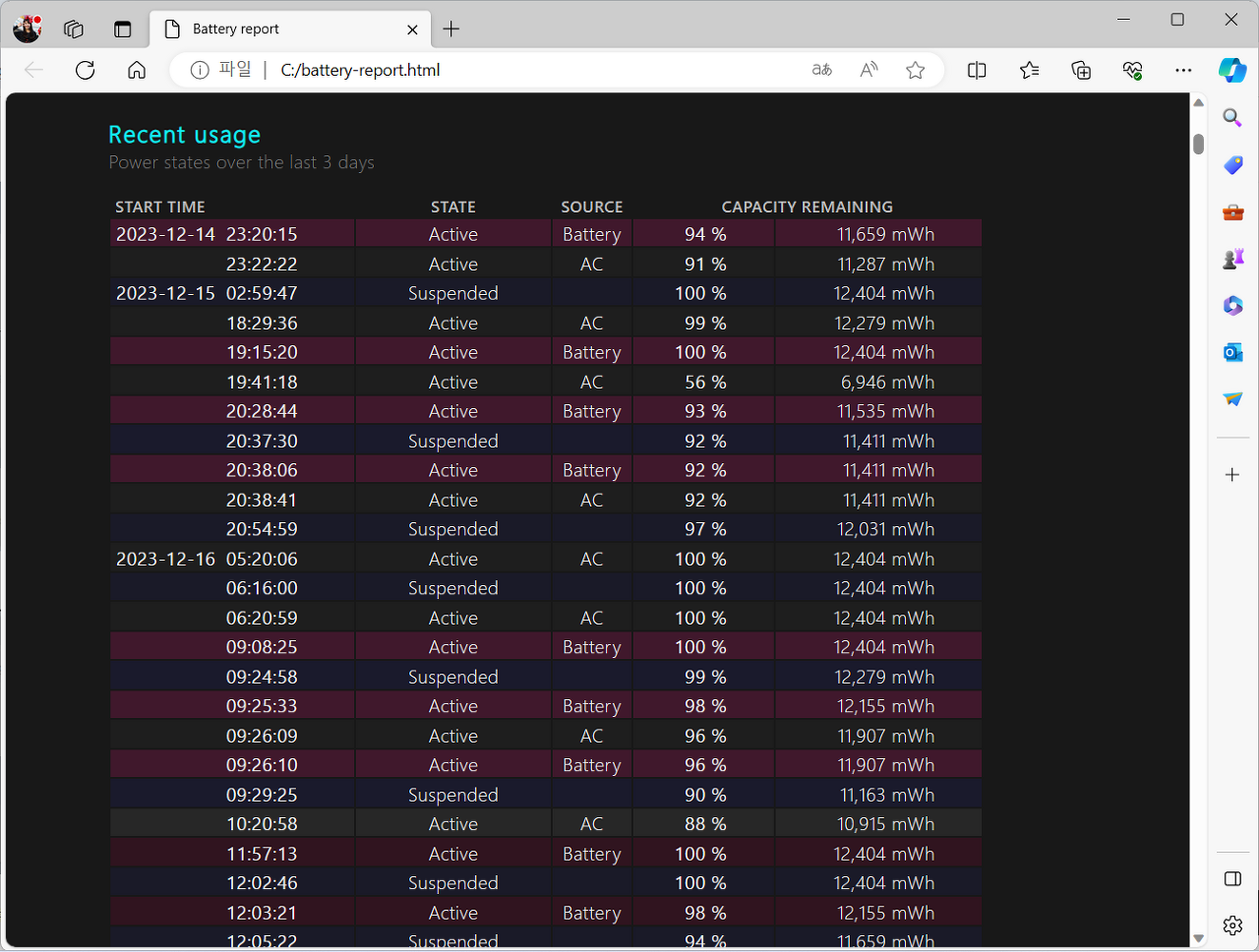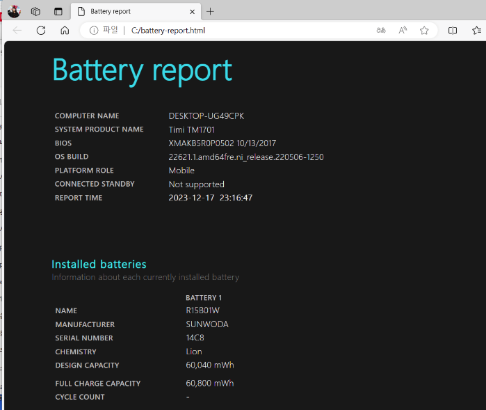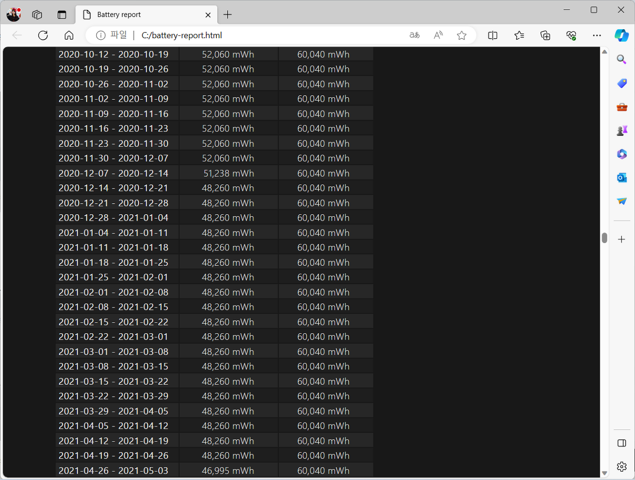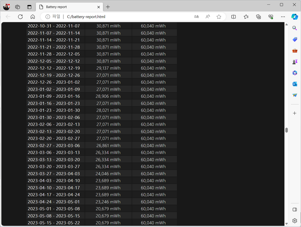 cmd 창을 관리자 권한으로 수행한 후, 위와 같이 명령어를 보내면 배터리 리포트를 받을 수 있습니다.