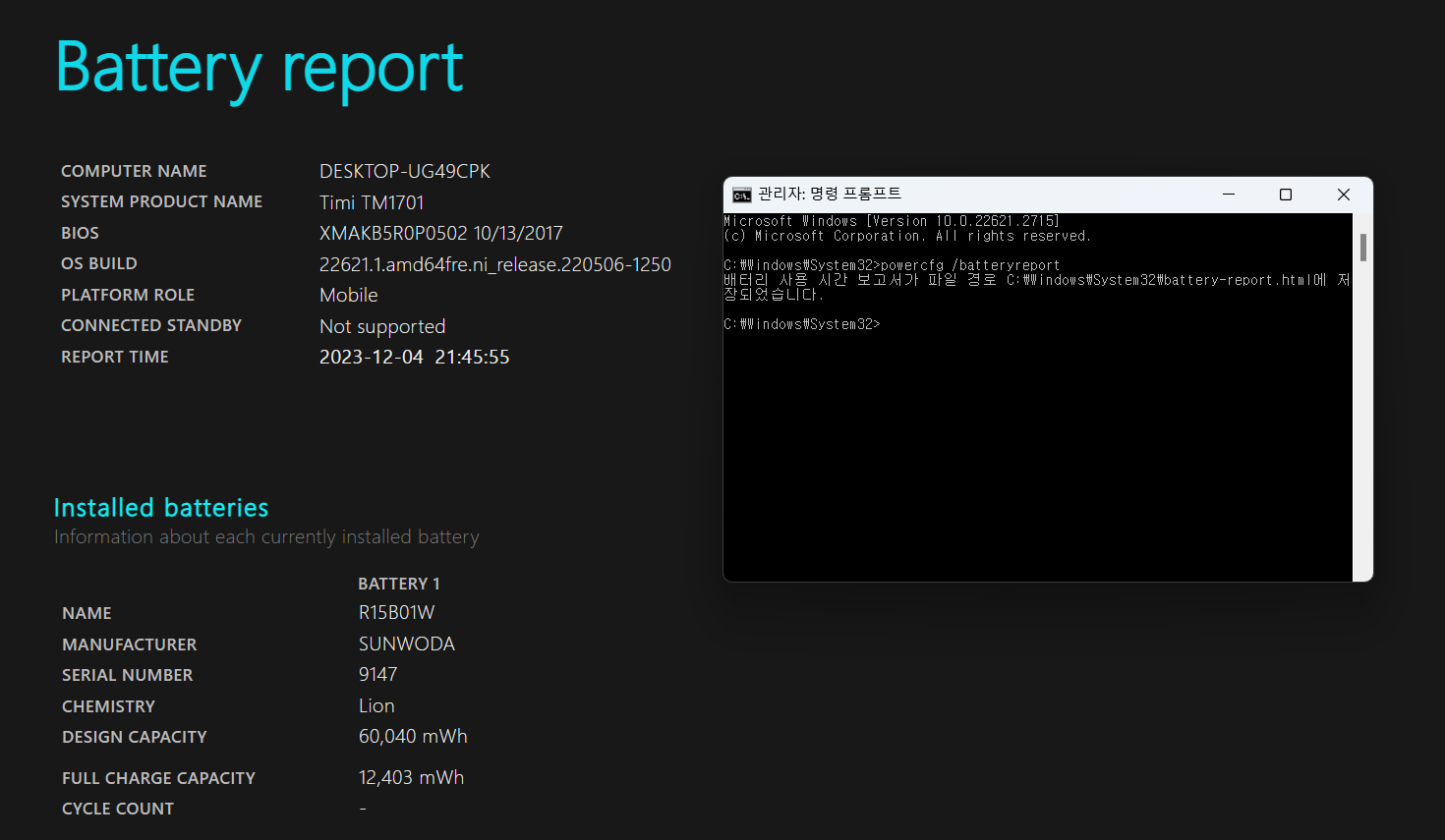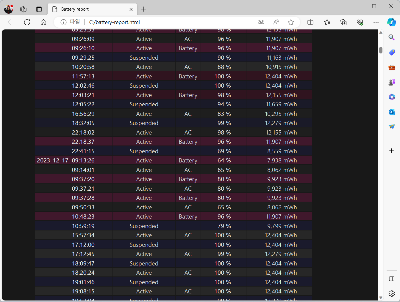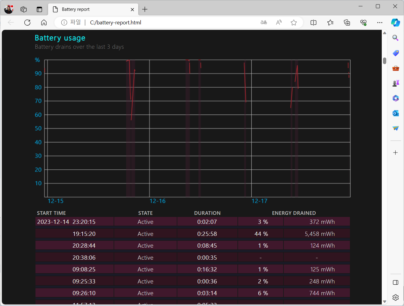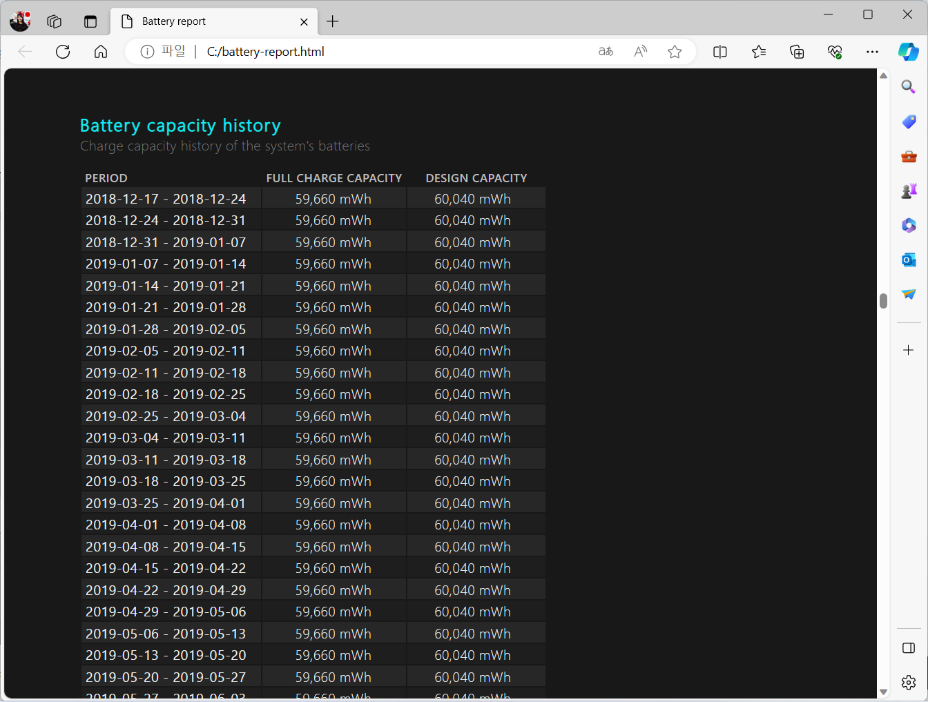 cmd 창을 관리자 권한으로 수행한 후, 위와 같이 명령어를 보내면 배터리 리포트를 받을 수 있습니다.