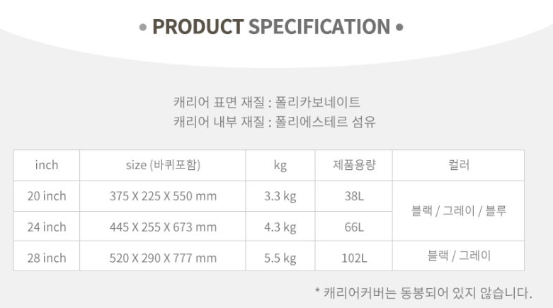 여행 갈 때 26인치, 28인치 캐리어도 필요하지만, 20인치 캐리어 사이즈는 기내 반입이 가능합니다. 그리고 하드 타입이라서 에코백 같은 천타입보다 내용물이 눌리거나 구겨지지 않아 좋아요.