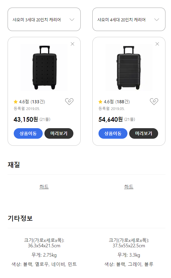 먼저, 샤오미 캐리어 4세대는 3세대에 비해 디자인과 모양에서 약간의 차이를 보입니다. 개인적으로는 4세대의 현대적이고 슬림한 디자인이 마음에 들었어요. 또 3세대는 PP재질이고 4세대는 PC 소재로 단단합니다.