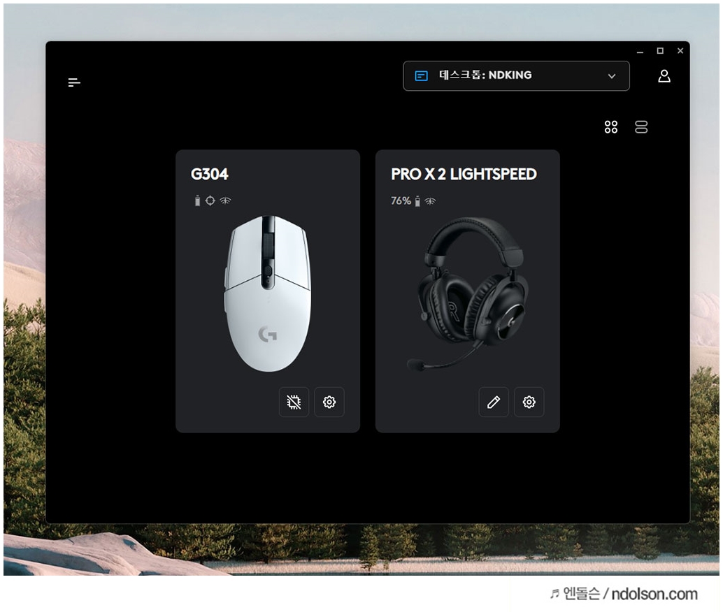 로지텍 장비들을 한눈에 볼 수 있으며, G PRO X 2 LIGHTSPEED 헤드셋을 클릭하면 다양한 설정 옵션에 접근할 수 있습니다.