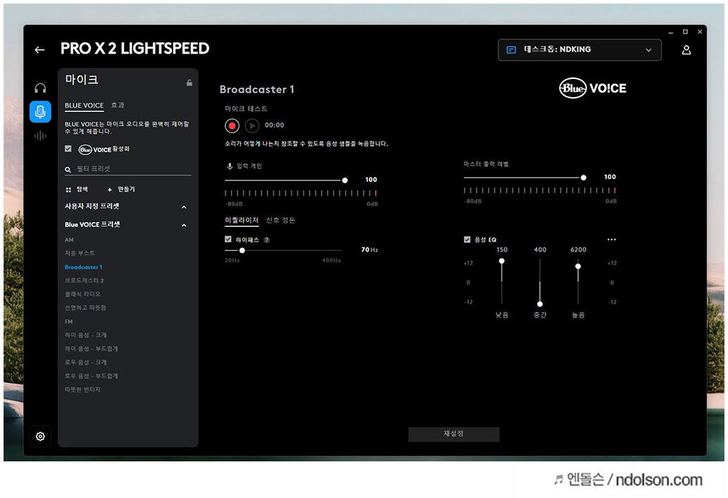 여기서 가장 인상적인 기능 중 하나는 바로 'BLUE VO!CE' 기술입니다. 마이크의 음성 품질을 사용자의 취향에 맞게 세부 조정할 수 있습니다. 예를 들어, 저음 부스트, 브로드캐스터 모드, 클래식 라디오 효과 등 다양한 프리셋 중에서 선택하거나, 직접 마이크 설정을 조정하여 원하는 사운드 프로필을 만들 수 있죠.