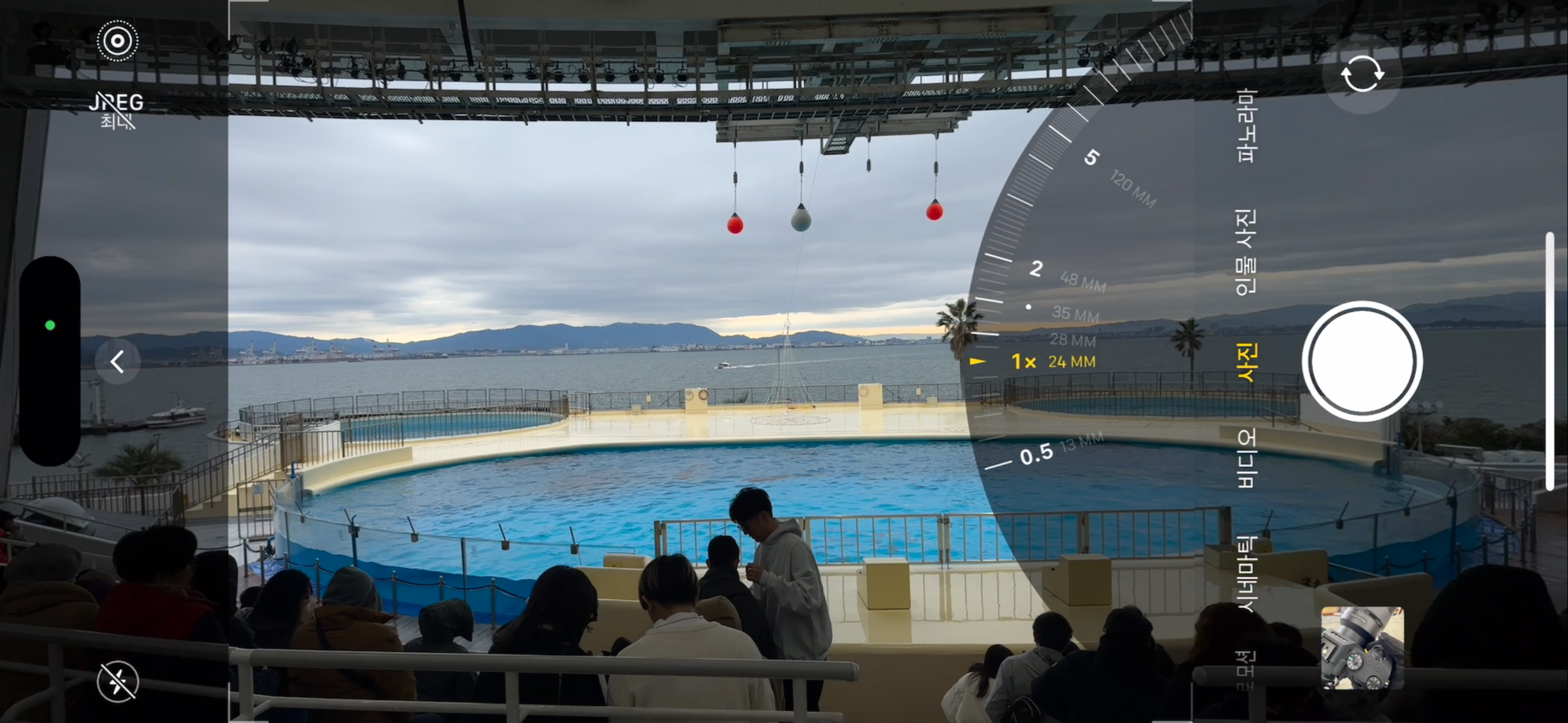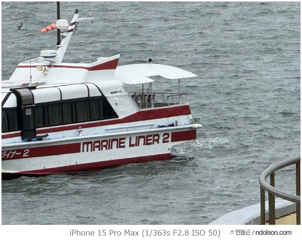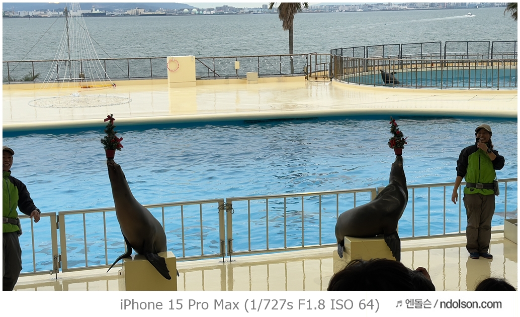 후쿠오카 수족과에서 아이폰 15 프로맥스로 촬영하였습니다. 멀리서 배가 오길래 25배줌 망원 카메라로 촬영하니 선명하게 촬영이 됩니다. 와이프가 사용하던 갤럭시 S23 울트라의 100배줌과는 비교하면 아쉽지만, 아이폰 14 프로맥스보다는 활용성이 큽니다.