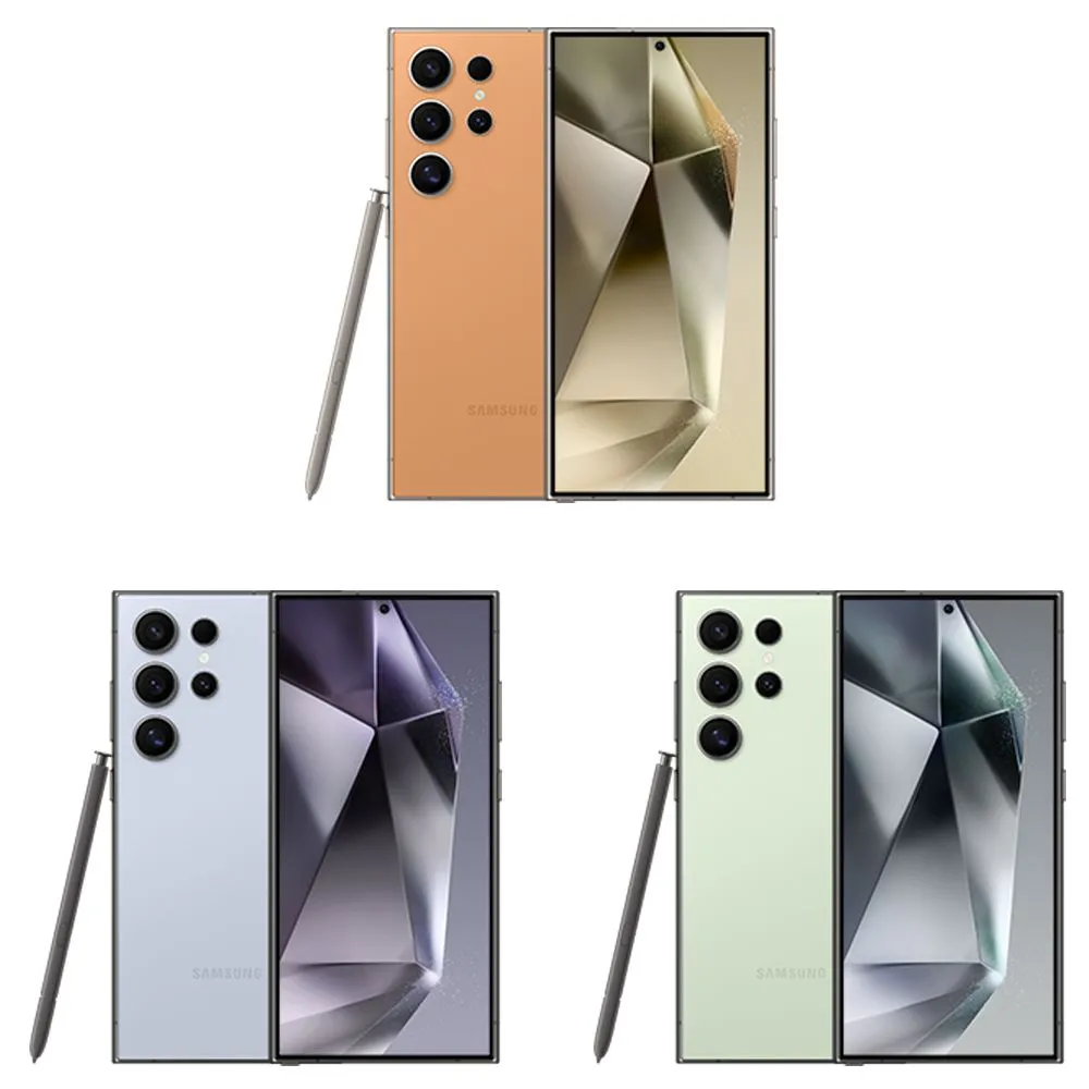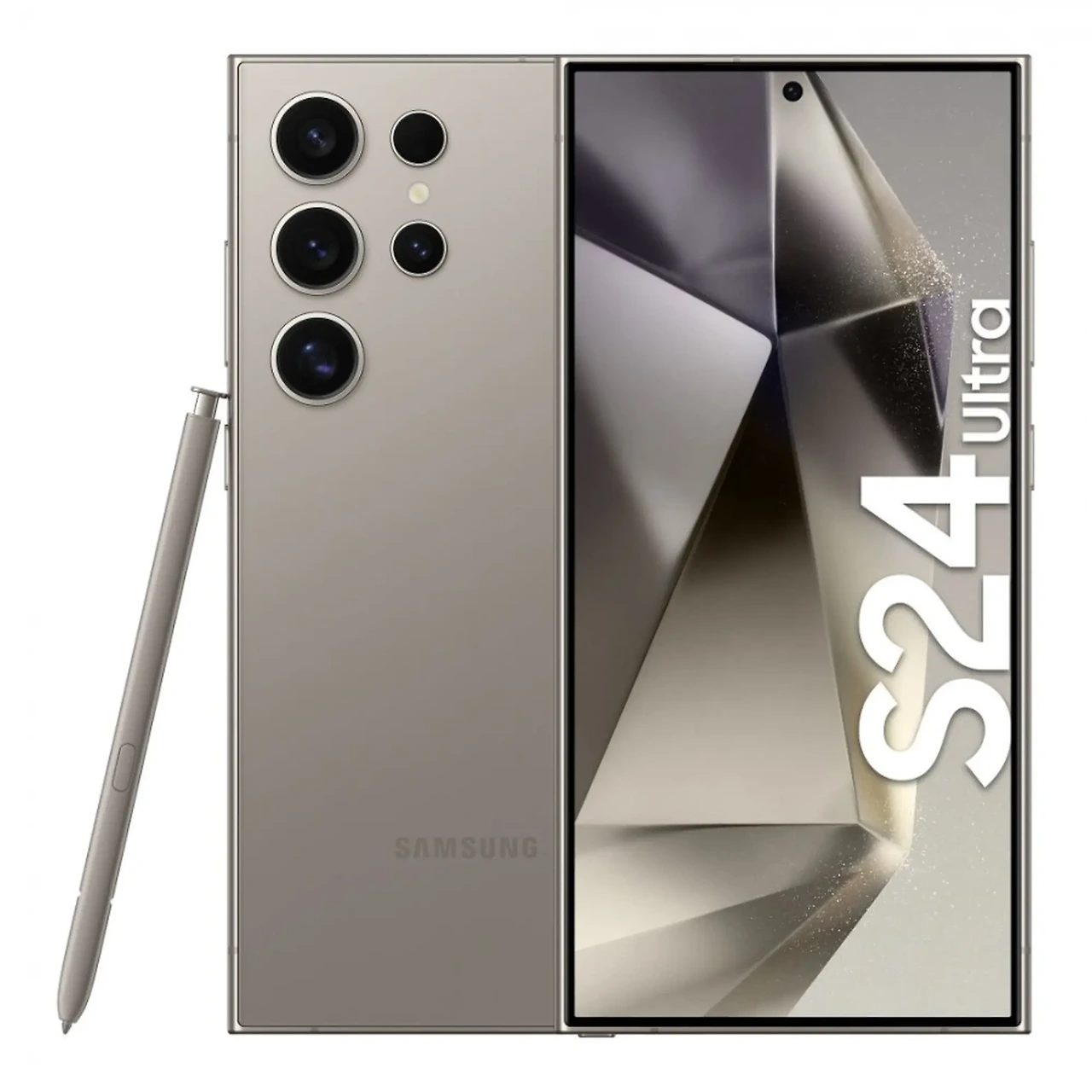 *갤럭시 S24 울트라 : 6.8인치 고해상도 디스플레이, 12GB 램, 쿼드 카메라 시스템, 5천mAh 배터리, 티타늄 프레임.
